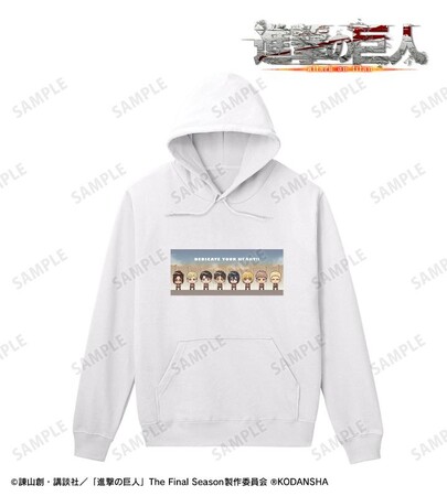 エレン、ミカサ、アルミン、ジャン、ライナー、リヴァイ、エルヴィン、ハンジがちょこんと立っているちびキャラを新たに描き起こし、パーカーに仕上げました。