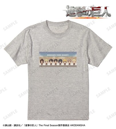 エレン、ミカサ、アルミン、ジャン、ライナー、リヴァイ、エルヴィン、ハンジがちょこんと立っているちびキャラを新たに描き起こし、Tシャツに仕上げました。