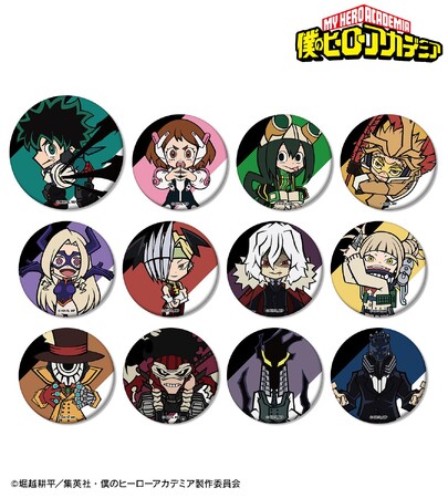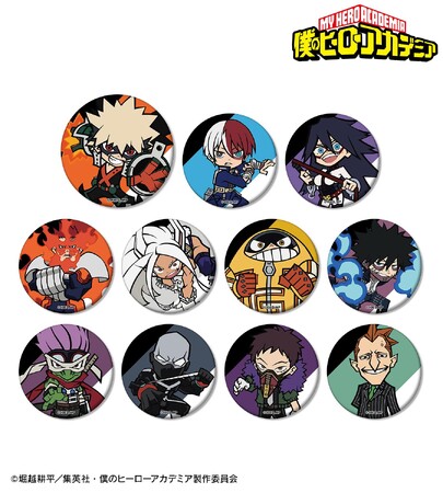 緑谷出久、轟焦凍、蛙吹梅雨、ホークス、Mt.レディ、リューキュウ、死柄木弔、トガヒミコ、Mr. コンプレス、ステイン、黒霧、オール・フォー・ワンをマットな手触りの缶バッジに仕上げました。