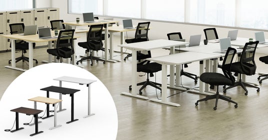 天板サイズ33種×カラー4色の中からお好きなサイズ・色を選べば、ローコストでまるで特注したようなデスクになります。天板の高さは735~1235mmまで昇降可能で、立ち座りを繰り返して身体の負担を軽減できます。耐荷重は70kgで、重量機器の設置にも対応します。