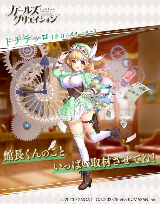 合同会社EXNOA(本社:東京都港区、CEO:村中 悠介、URL:https://games.dmm.com/)が運営するDMM GAMESにおいて、「クリエイティブチーム くまさん」第4弾作品となる『ガールズクリエイション -少女藝術綺譚-』(以下、『ガールズクリエイション』)にて、イベント「アテネス新聞☆魅力発掘街巡り!」の開催と、ドナテッロ★5スタイル【全力☆リポーター】とブグロー★5スタイル【瞬間フォーカス】の登場をお知らせいたします。