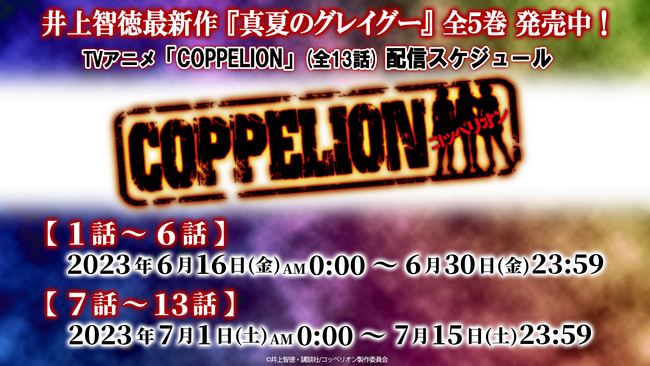 「COPPELION」などで知られる、井上智徳先生の「真夏のグレイグー」 最新第5巻が5月17日に発売され、堂々の完結を迎えました。これを記念して、講談社が運営するYouTubeチャンネル「フル☆アニメTV」にて、TVアニメ「COPPELION」全13話を無料配信いたします。【第1話~第6話】を本日6月16日から6月30日まで、【第7話~第13話】を7月1日から7月15日までの期間限定配信となりますので、新作「真夏のグレイグー」と一緒にぜひお楽しみください!