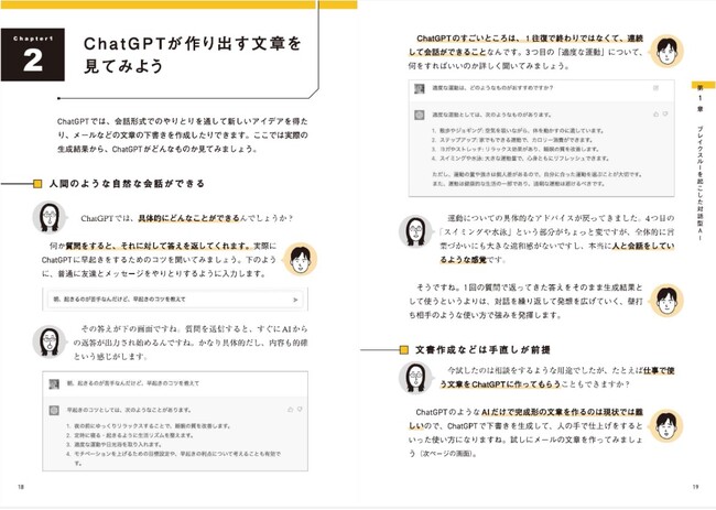 本書は、対話型AIを活用した「Catchy」などのサービスの開発に携わっている古川渉一氏に、「ChatGPTは何がすごいの?」「ビジネスのどんな用途で役立つの?」といったさまざまな疑問を投げかけ、やさしく丁寧に解説する形式になっています。「AIはどうやって人間の言葉を理解しているの?」「AIは人間と同じように考えて文章を作っているの?」といった、AIの技術に関する疑問も解消できます。機械学習やディープラーニング、そして自然言語処理といったAIのしくみや専門用語も丁寧に解説しているので、知識ゼロでもスラスラ読めます。