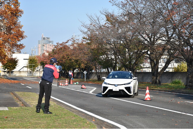 等間隔で一列に並べられたパイロン(三角コーン)の間を、「早く」「近く」「接触しない」でジグザグに走行します。ハンドルなどの運転操作や車の挙動を確認します。