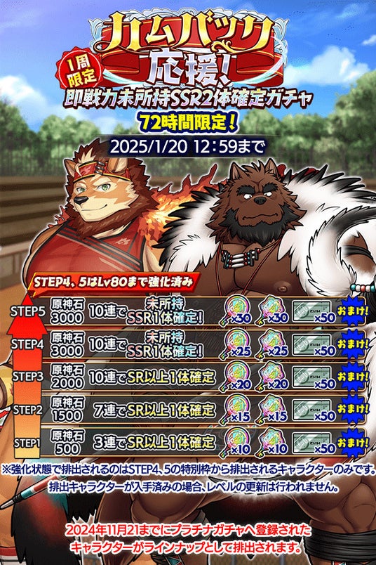 2024年11月21日までにプラチナガチャへ登録されたキャラクターがLv80まで強化済みで入手できるガチャが2種期間限定で登場!