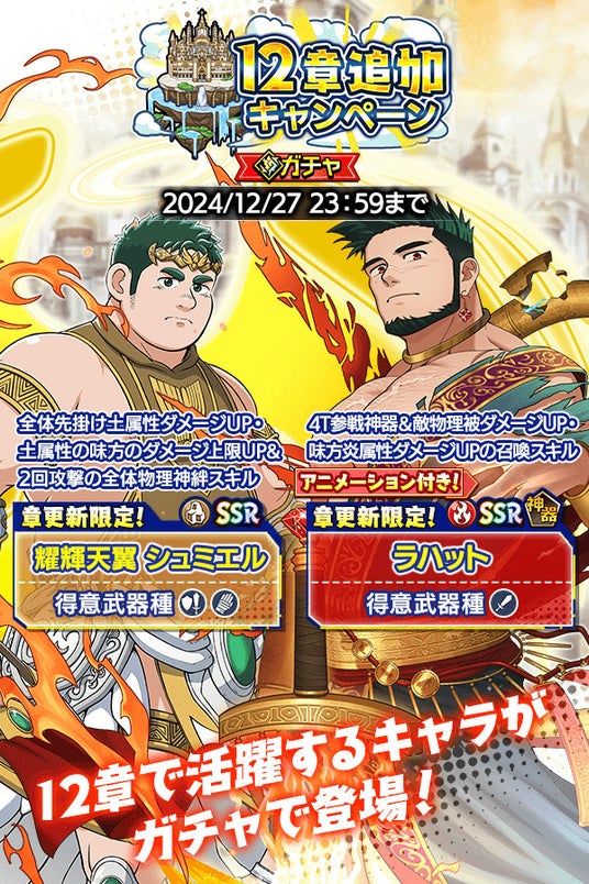 SSR魂友「耀輝天翼 シュミエル」とSSR神器「ラハット」がピックアップされた「12章追加キャンペーンガチャ」をお見逃しなく。
