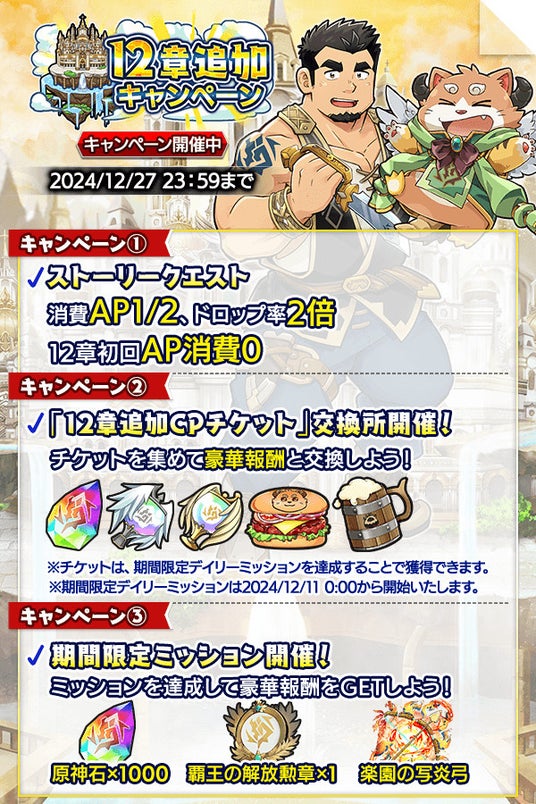 ストーリークエストAP1/2、ドロップ率2倍、12章初回クリア消費AP0