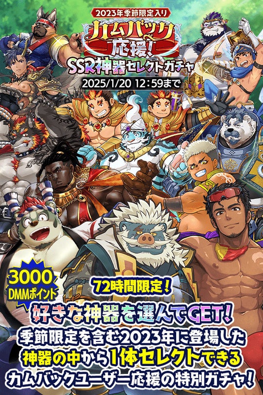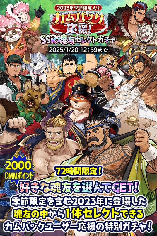 魂友を選択できる「カムバック応援! 2023年季節限定入りSSR魂友セレクトガチャ」、神器を選択できる「カムバック応援! 2023年季節限定入りSSR神器セレクトガチャ」の2種となりますので、この機会にぜひお買い求めください。