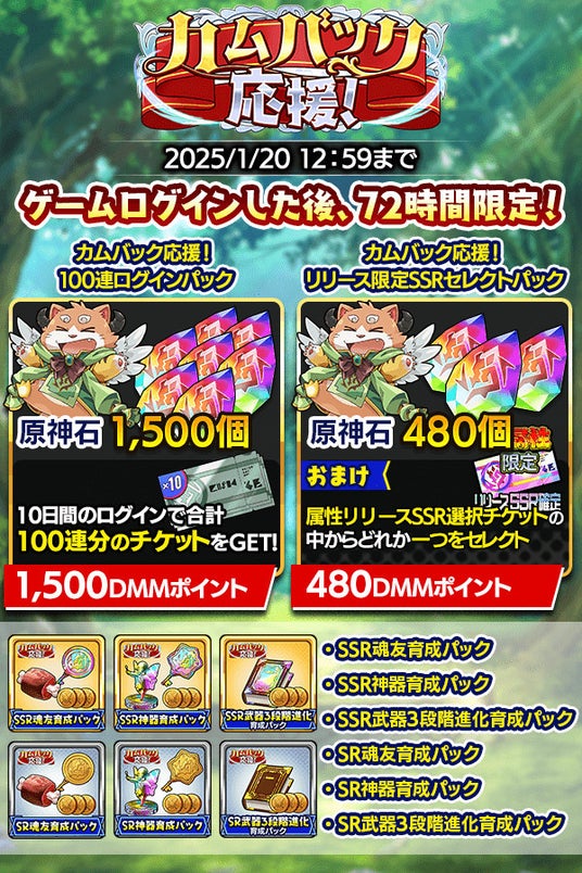 原神石に加えて100連分のガチャチケットが獲得出来るログインパックや、6属性のうちどれか1属性のリリースSSR選択チケットが付いてくる超お得なカムバックキャンペーン限定のパック商品も登場!