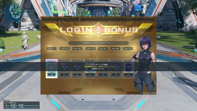 期間中、「攻殻機動隊 SAC_2045ステッカー」や、クリエイティブスペース用のビジュアルポスターなどのコラボアイテムが最大で7日間受け取れる特別なログインボーナスを開催します。
