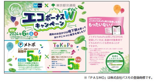 東京地下鉄株式会社(本社:東京都台東区、代表取締役社長:山村 明義、以下「東京メトロ」)と東京都交通局(東京都新宿区、交通局長:久我 英男)は、東京の地下鉄サービス一体化の取組の一環として、6月の環境月間にあわせて東京メトロ・東京都交通局の会員制ポイントサービス「メトロポイントクラブ(以下「メトポ」)」と「ToKoPo(トコポ)」を活用した「エコボーナス W(ダブル)キャンペーン」を実施いたします。