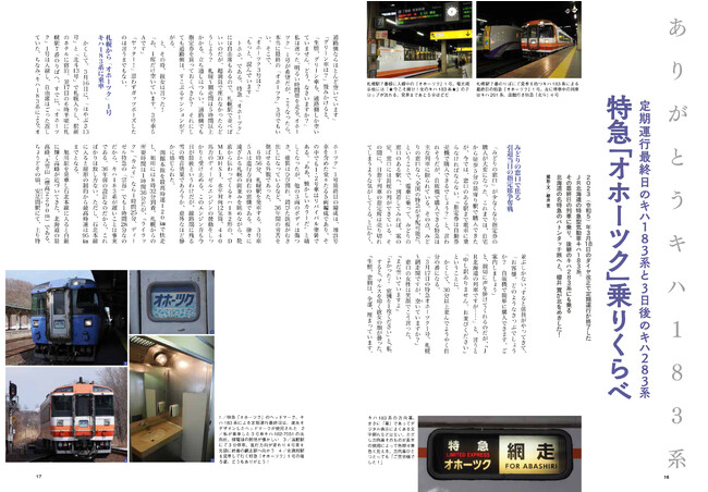 3月17日に定期運行から引退したその日の特急「オホーツク」に鉄道フォトジャーナリスト・櫻井 寛さんが乗車。キハ183系に別れを告げるとともに、これからの石北本線特急を担うキハ283系の特急「オホーツク」と乗りくらべをレポートしています。