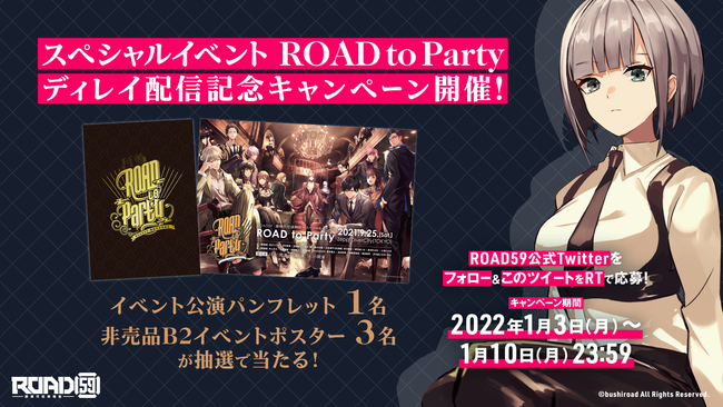 株式会社ブシロード(本社︓東京都中野区 代表取締役社長︓橋本義賢、以下、ブシロード)は、現在実施中の「ROAD59 -新時代任侠特区- スペシャルイベント ROAD to Party」期間限定ディレイ配信を記念したキャンペーン第2弾を開始いたしました。報道関係の皆様におかれましては、ぜひ本情報をお取り扱いいただけますようお願い申し上げます。