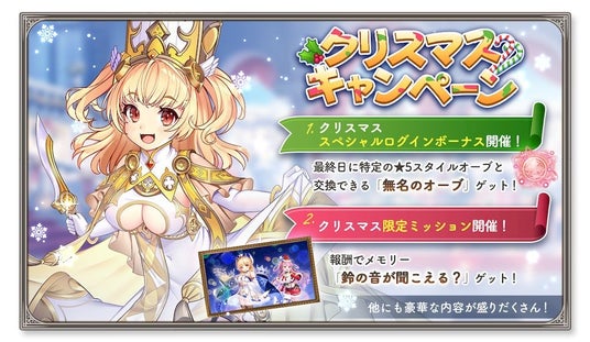 特定の★5スタイルオーブと交換できる「無名のオーブ」が獲得できるクリスマススペシャルログインボーナスや、メモリー「鈴の音が聞こえる?」他、様々な報酬が獲得できるクリスマス限定ミッションを実施しております。