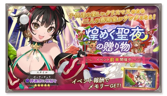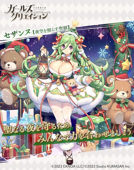合同会社EXNOA(本社:東京都港区、CEO:村中 悠介、URL:https://games.dmm.com/)が運営するDMM GAMESにおいて、「クリエイティブチーム くまさん」第4弾作品となる『ガールズクリエイション -少女藝術綺譚-』(以下、『ガールズクリエイション』)にて、「クリスマスキャンペーン」およびクリスマスイベント「煌めく聖夜の贈り物」を開催いたしました。また、クリスマス衣装のボッティチェリ★5スタイル【降誕祭に祝福を】とセザンヌ★5スタイル【夜空を照らす聖樹】が新登場のピックアップガチャの開催もお知らせいたします。