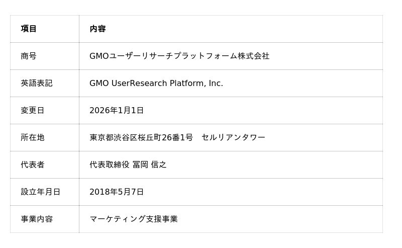 GMOインターネットグループのGMOプレイアド株式会社(※)(代表取締役:冨岡 信之)は、事業内容の進化と今後の成長戦略を明確にするため、社名を「GMOユーザーリサーチプラットフォーム株式会社(英語表記:GMO UserResearch Platform, Inc.)」へ、2026年1月1日付で変更いたします。