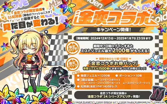 合同会社EXNOA(本社:東京都港区、CEO:村中 悠介、URL:https://games.dmm.com/)と株式会社KMS(本社:東京都品川区、代表:梶原 健太郎、URL:http://kms3.com/)は、『ミストトレインガールズ~霧の世界の車窓から~』において、2024年12月13日(金)より『金色ラブリッチェ』とのコラボを開催することをお知らせいたします。
