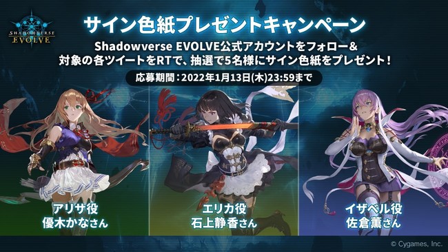 『Shadowverse EVOLVE』公式アカウント(@shadowverse_ev)をフォローしてキャンペーンツイートをRTすると、エリカ役 石上静香さん、イザベル役 佐倉薫さん、アリサ役 優木かなさんのサイン色紙を抽選で各5名様にプレゼントします。