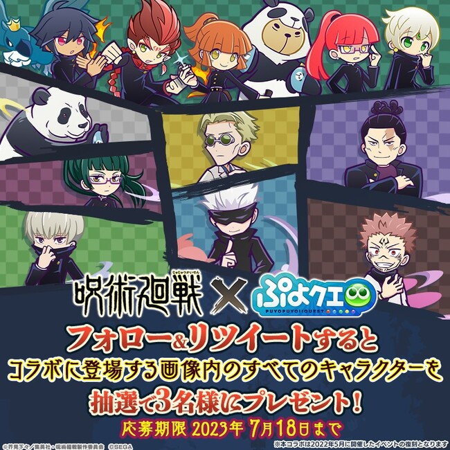株式会社セガは、大好評配信中のパズルRPG『ぷよぷよ!!クエスト(以下、『ぷよクエ』)』にて、2023年7月6日(木)より第2期が放送開始となるTVアニメ『呪術廻戦』とのコラボレーションイベントを、本日7月5日(水)より復刻で開催します。