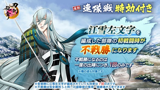 今回の「連隊戦」では刀剣男士「江雪左文字(cv. 佐藤拓也)」を部隊に編成して出陣すると特別な効果が発動します。