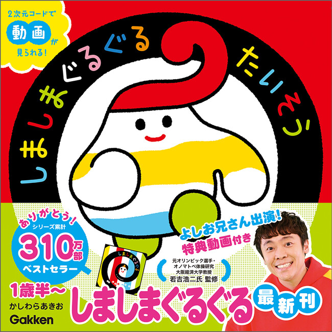 元オリンピック選手監修!「しましま」「ぐるぐる」のかけ声に合わせて、新キャラ「しまぐー」が体操する、話題の最新刊。かわいいアニメーションと、よしお兄さんこと小林よしひささんが出演する実写動画付き。