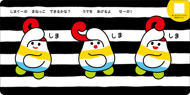 絵本『しましまぐるぐる』みたいに「しましま」で、「ぐるぐる」で、よーく見ると色味もそっくりな、シリーズ初の公式キャラクター「しまぐー」が初登場。シリーズでもおなじみの「いぬ」や「ねこ」、「さかな」、「へび」達と一緒に、元気いっぱい体を動かします。これまで同様、お子さんが注目しやすいコントラストの強い絵柄や「かお」も必見です。