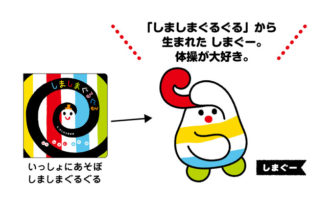 最新刊の「しましまぐるぐるたいそう」は、オノマトペに合わせて思わず身体が動きだす一冊。「しましま」で「ぐるぐる」の新しいキャラクター、「しまぐー」がシリーズお馴染みの動物たちと楽しく体操します。
