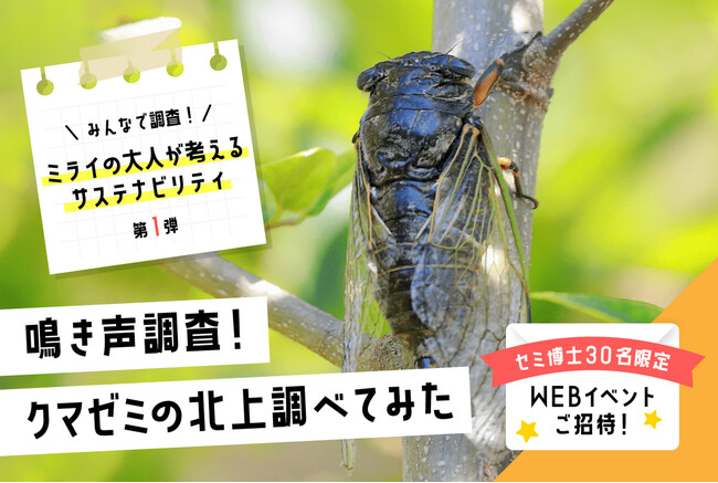 「次世代を担う子ども達に幸せな暮らしを!」をコンセプトに、第一弾は、子ども達によるクマゼミの北上調査を行います。クマゼミの生息域を子ども達に投稿してもらい、セミの生態系や地球環境の変化・街の都市化等、子ども達視点の自由な発想をあらゆる方面から応援して、楽しみながら、世の中に新しい価値提案を行うことを目的としています。
