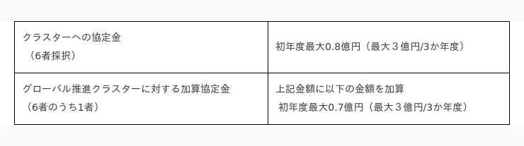 ・このうち、有力な海外支援機関(海外大学、海外アクセラレータ等)と連携し、グローバルスタンダードな支援を強力に行う1者を、「グローバル推進クラスター」に選定します。