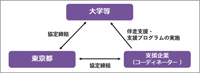 東京都と連携し、コーディネーターが大学発スタートアップ創出に向けた大学等の取組に対する伴走支援及び支援プログラムを実施します。