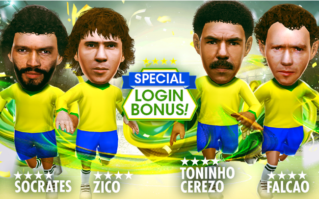 ★4バージョンの「ジーコ」、「ファルカン」、「ソクラテス」、「トニーニョ・セレーゾ」など名選手がもらえるスペシャルログインボーナスもあわせて実施します。