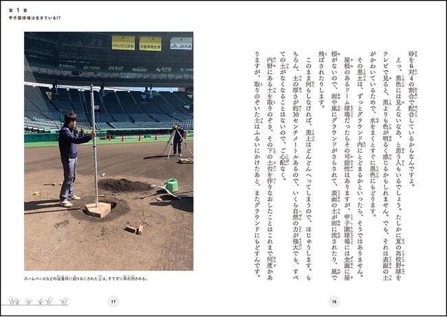 児童書ノンフィクション『すごいグラウンドの育て方 阪神甲子園球場のひみつ』では、テレビやネットでのプロ野球・高校野球中継時にその整備姿が注目され、“神整備”とも称されるようになった阪神園芸のグラウンド整備について紹介。阪神園芸株式会社の甲子園施設部長のグラウンドキーパー・金沢健児さんが、子どもたちに向けて、まるで生きているかのような外野の芝と内野の土のひみつや、阪神甲子園球場と雨との大事な関係、グラウンドキーパーという仕事の過去・現在・未来、阪神タイガースの名選手とのエピソードなどについて語ってくれています。解説イラストや、阪神園芸のスタッフ自らがおさめた貴重な写真資料も掲載し、阪神甲子園球場の新たな魅力を知ることができる本です。