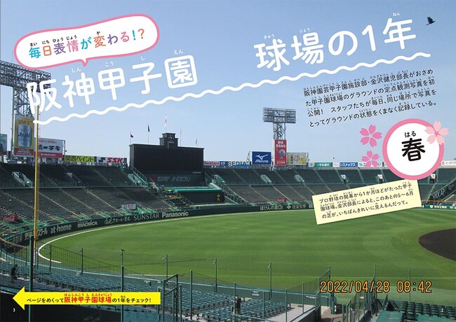 巻頭ページでは、阪神甲子園球場の1年間の様子をおさめた、阪神園芸秘蔵の写真資料を大公開。外野・内野グラウンドにおける作業風景のようすも写真つきで紹介しています。