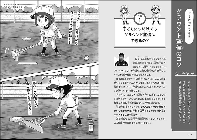 写真だけでなくイラストも交えて解説。巻末ページでは、子どもたちの身近にあるグラウンドの整備の仕方や、まっすぐラインを引くコツなどもイラスト付きで説明しています。