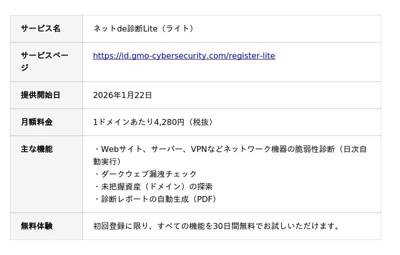GMOインターネットグループのGMOサイバーセキュリティ byイエラエ株式会社(代表取締役CEO:牧田 誠 以下、GMOサイバーセキュリティ byイエラエ)(※1)は、サイバーセキュリティ対策に課題を抱える日本の中小企業に向けた新サービス「GMOサイバー攻撃 ネットde診断 Lite」の提供を、2026年1月22日に開始しました。