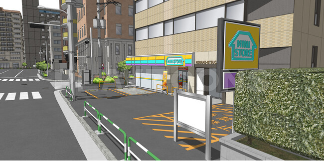 この3D背景は、生活感あふれるコンビニを中心とした街の風景を広範囲にわたって再現しています。