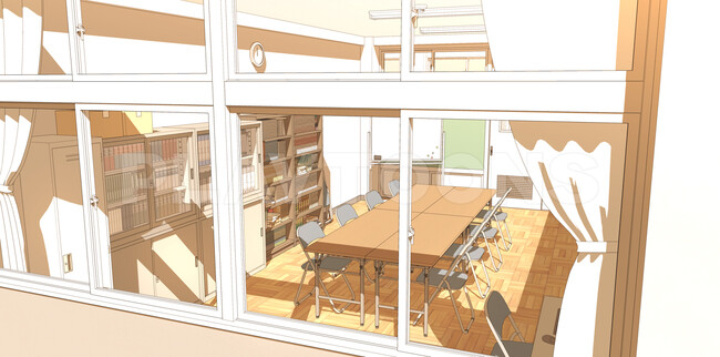 部室だけでなく、廊下や窓も制作しているため、廊下から部室への入場シーンや窓からの外観など、様々なシーンに対応可能です。