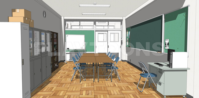 実際の部室の構成と雰囲気をSketchUpで精密に制作し、部室特有の小物やポスターなど、部活動のシーンに必要なアイテムを豊富に取り揃えました。