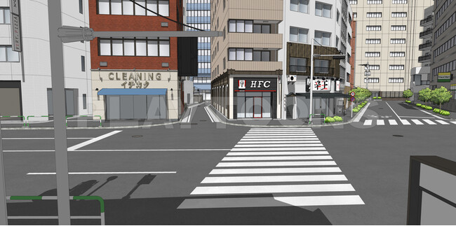 SketchUpで細かく制作されたこの背景には、2つのコンビニを含む四ブロックの街並みが含まれており、それぞれの建物が異なるデザインでモデリングされています。