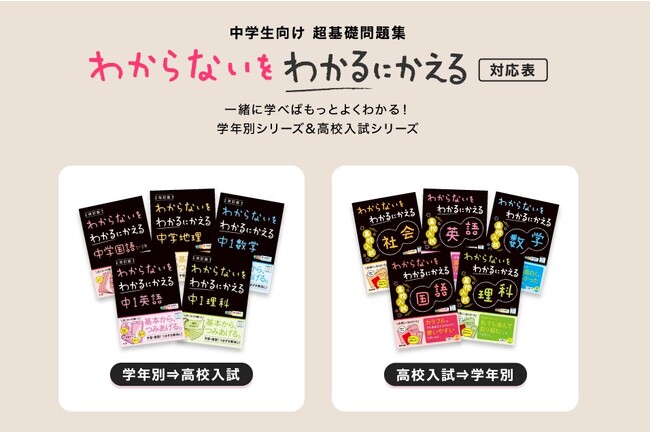 『わからないをわかるにかえる 学年別』シリーズと『わからないをわかるにかえる 高校入試』シリーズのどのページが対応しているかが一目でわかる、対応表がダウンロードできます。