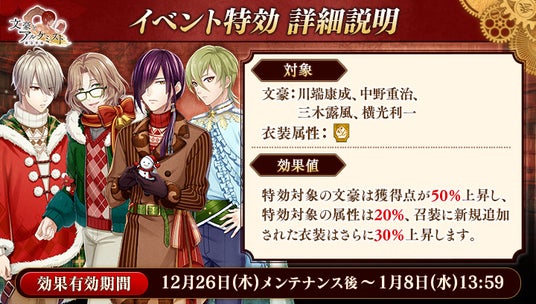 さらに、イベントと同時に開催される限定召装『聖夜ヲ楽シム準備』にて新規追加された「中野重治」「川端康成」「三木露風」の〈クリスマス衣装〉を編成すると、得点の獲得率がそれぞれ30%上昇します。