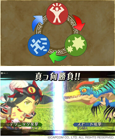 「モンスターハンター ストーリーズ」シリーズのバトルの基本は、じゃんけんのような3すくみのシステムになっています。