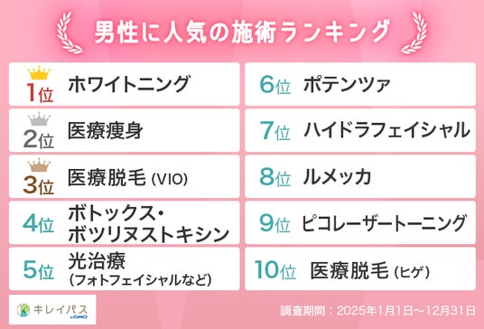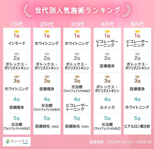 GMOインターネットグループのGMOビューティー株式会社(本社:東京都渋谷区、代表取締役社長:高橋 良輔)が運営する、美容医療の検索・予約サービス「キレイパス byGMO」(https://kireipass.jp/)は、同サービスの利用者のデータに基づき、「2025年美容医療人気ランキング」および「2026年美容医療トレンド予測」を2026年2月2日(月)に発表しました。