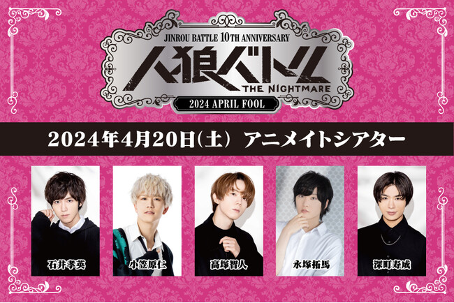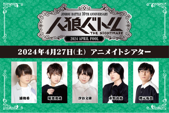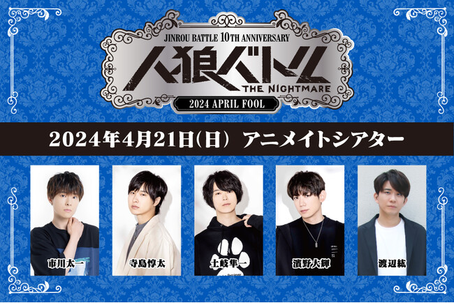 1回の決断が運命を左右するスリルに満ちたゲーム展開や数々の好プレイ・珍プレイで楽しさをお届けしてきた声優『人狼バトル』企画が、開催から10周年を迎えました。節目の年となる2024年は、アニメイトシアターで計15名の男性声優の皆様をお招きし、3日間に渡る熱戦をお届けします。イベント参加のチケットは抽選制で、3月31日(日)23:59まで受付を行っております。