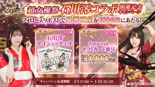 人気セクシー女優の石川澪さんとのコラボレーションを記念して、抽選で合計100名様にゲーム内に登場する衣装を着用したサイン入りチェキや、最大10,000円のAmazonギフトカード番号が当たるキャンペーンを実施いたします。