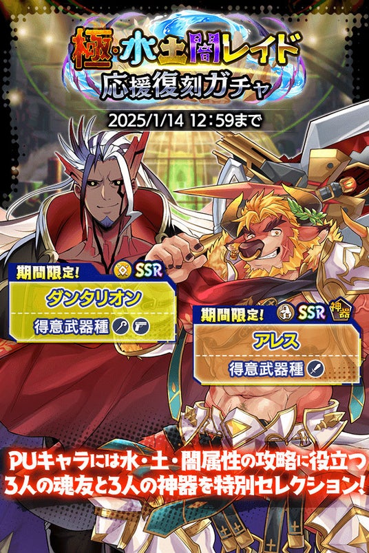 「ダンタリオン」「アレス」など期間限定キャラを含む、過去キャラクターたちが復刻する特別なガチャが開催!水・土・闇属性の攻略に役立つ、3人の魂友と3人の神器がピックアップされた「極・水土闇レイド応援復刻ガチャ」をお見逃しなく。