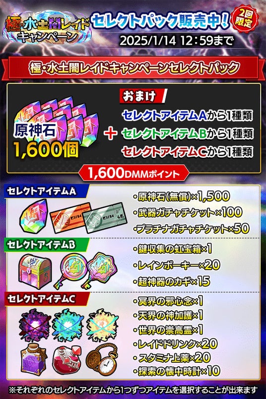 原神石に加えて、ガチャチケットや限界突破アイテムなど、お好きなアイテムを選択できる「極・水土闇レイドキャンペーンセレクトパック」が登場!
