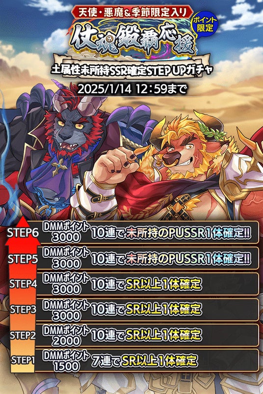 さらに、STEP5、6でピックアップされた未所持SSRが1体確定する「仗魂鍛覇応援土属性未所持SSR確定ステップアップガチャ」も同時開催!