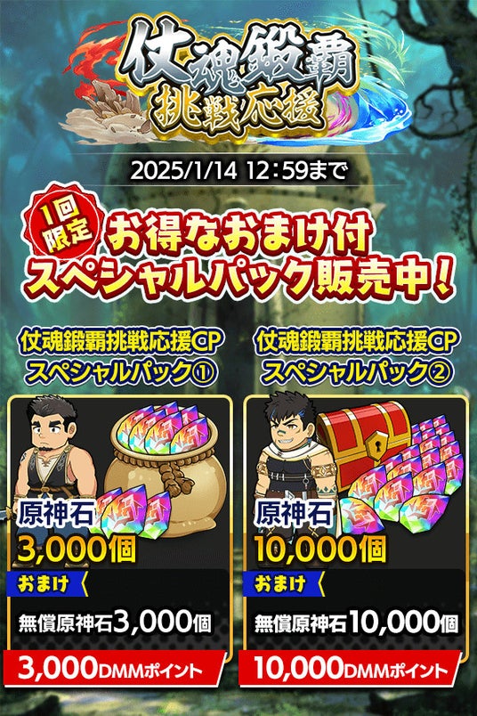 期間中、原神石がおトクに購入できる「仗魂鍛覇挑戦応援キャンペーンスペシャルパック」が2種登場!この機会をお見逃しなく。