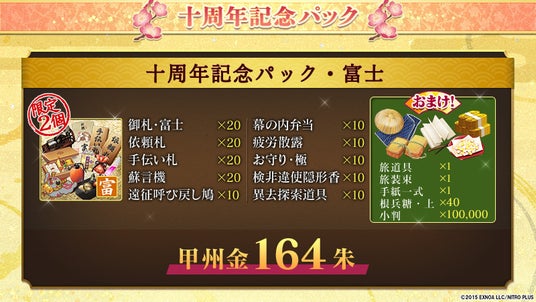 期間中、ゲームにログインした全ての方を対象に、景趣「刀剣乱舞十周年記念」、景趣「刀剣乱舞十周年記念・祝花」や「十周年祝カットけいき」、「御祝重弁当」などをプレゼントいたします。